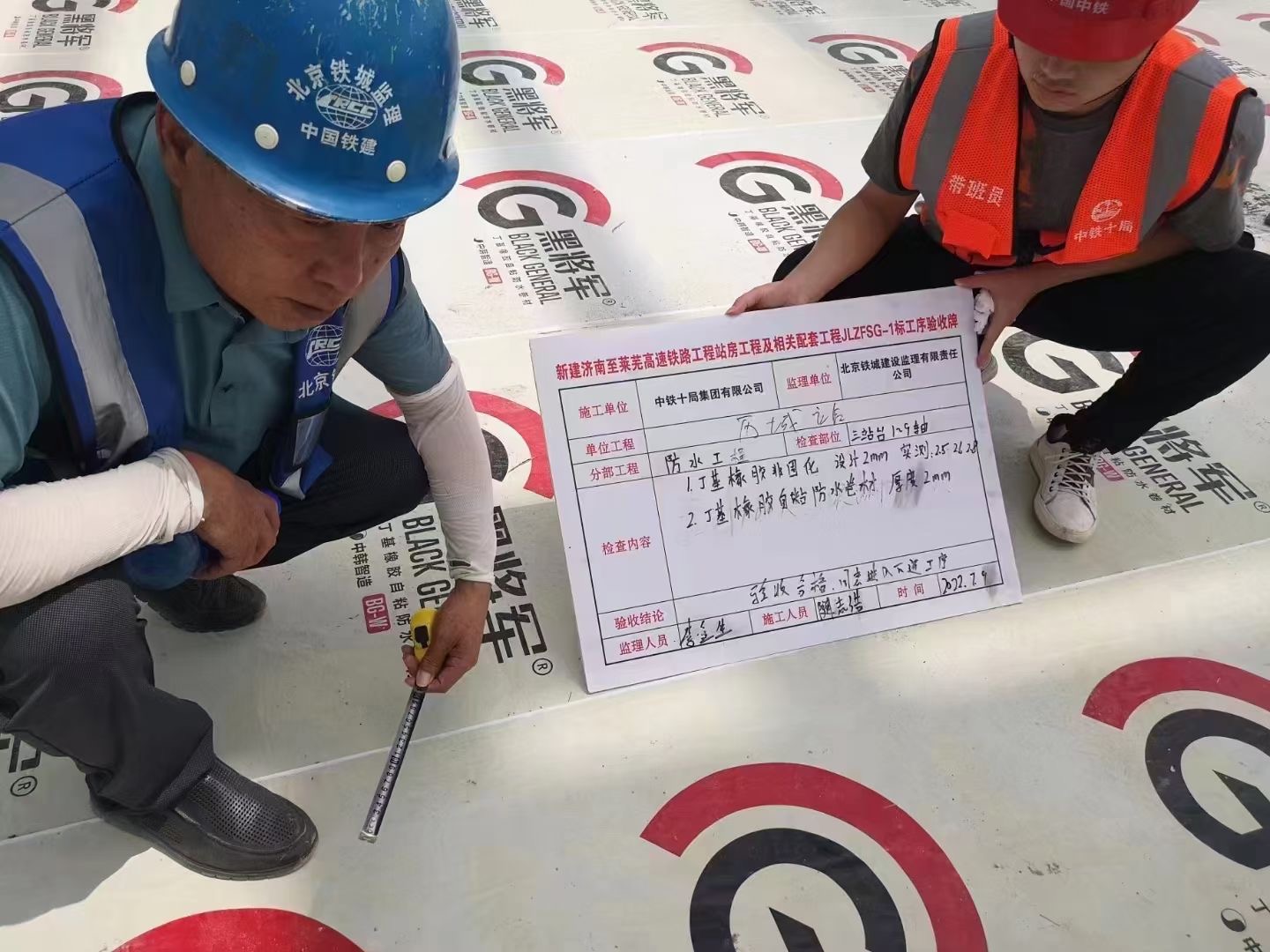 2021年11月份,歷城站(更名前為港溝站)的主體結構底板防水工程,總包單位就因為看中了黑將軍產品的寬幅耐溫性,選用了黑將軍BG-Y丁基橡膠高分子自粘膠膜防水卷材,九鼎宏泰交付了滿意的答卷。