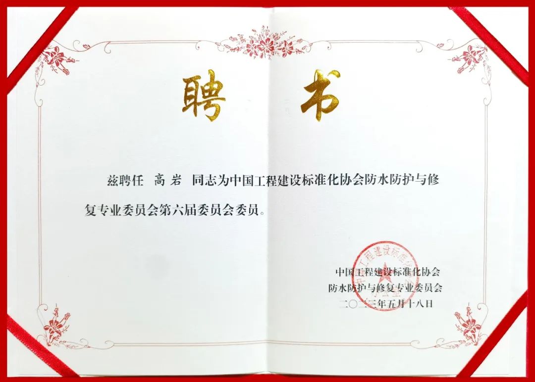 正是企業(yè)自身實力與自愈合技術的加持,遼寧九鼎宏泰防水科技有限公司董事長高巖被聘為中國工程建設標準化協(xié)會防水防護與修復專業(yè)委員會第六屆委員會委員。