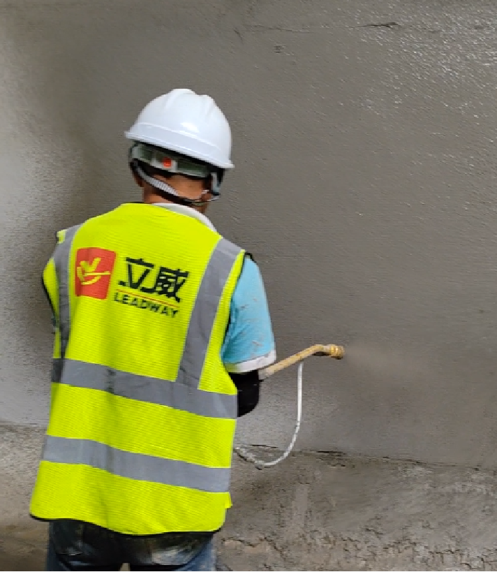 2)施工中:兌水?dāng)嚢钑r,粉料與清水混合比例為:1:0.25~0.28(可根據(jù)自己需要的稀稠度加入清水),必須使用電動攪拌器器充分?jǐn)嚢?3 分鐘以上,靜置 2 分鐘方可進(jìn)行涂刷使用,配好的混合料須在約1小時內(nèi)使用完畢。施工交叉刮涂2道,厚度1-2mm,用量2-4kg/㎡,施工完成后需養(yǎng)護(hù)2-3天。