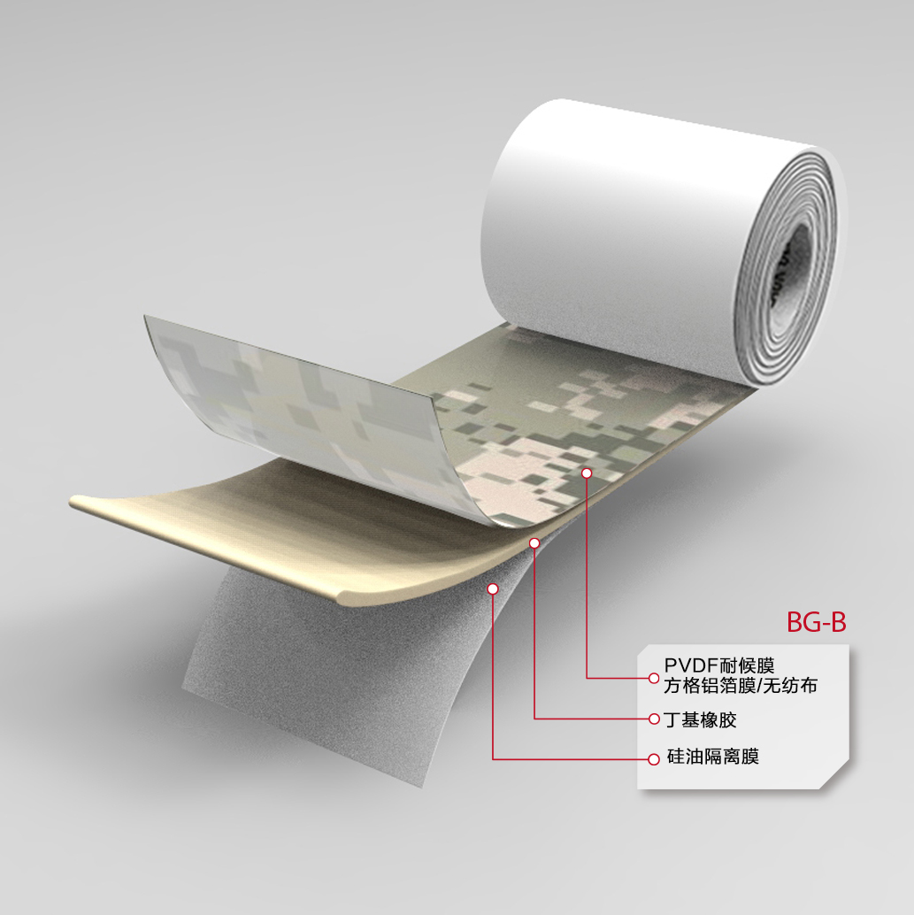 BG-B 將軍貼丁基膠帶是以氟碳耐候膜、鋁箔膜或麗新布等材料為覆面膜,以丁基橡膠為粘結(jié)材料,并覆以隔離材料而制成的可以與各種基層緊密粘結(jié)的粘結(jié)密封材料。